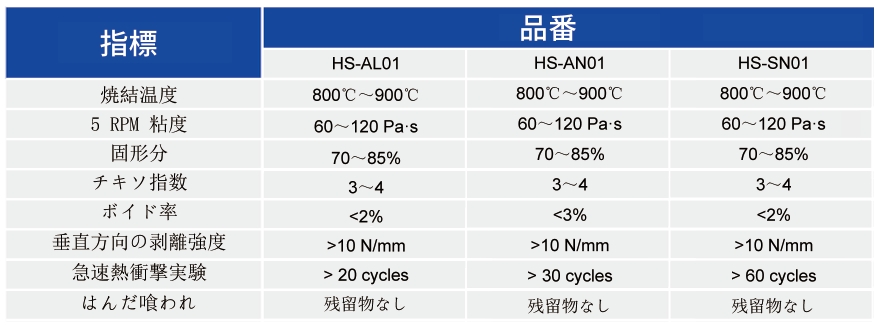 (1)HS-AL01は、Al203セラミック銅被覆用の活性金屬接合(AMB)用のペーストです。 (2)HS-AN01は、AlNセラミック銅被覆用の活性金屬接合(AMB)用のペーストです。 (3)HS-SN01は、Si3N4セラミック銅被覆用の活性金屬接合(AMB)用のペーストです。 本シリーズのペーストは製造が簡単で、印刷特性に優(yōu)れ、セラミックスとの濡れ性が良好です。接合後のボイド率が低く、接合強度が高いので耐冷熱衝撃性能が良好で信頼性が高い。